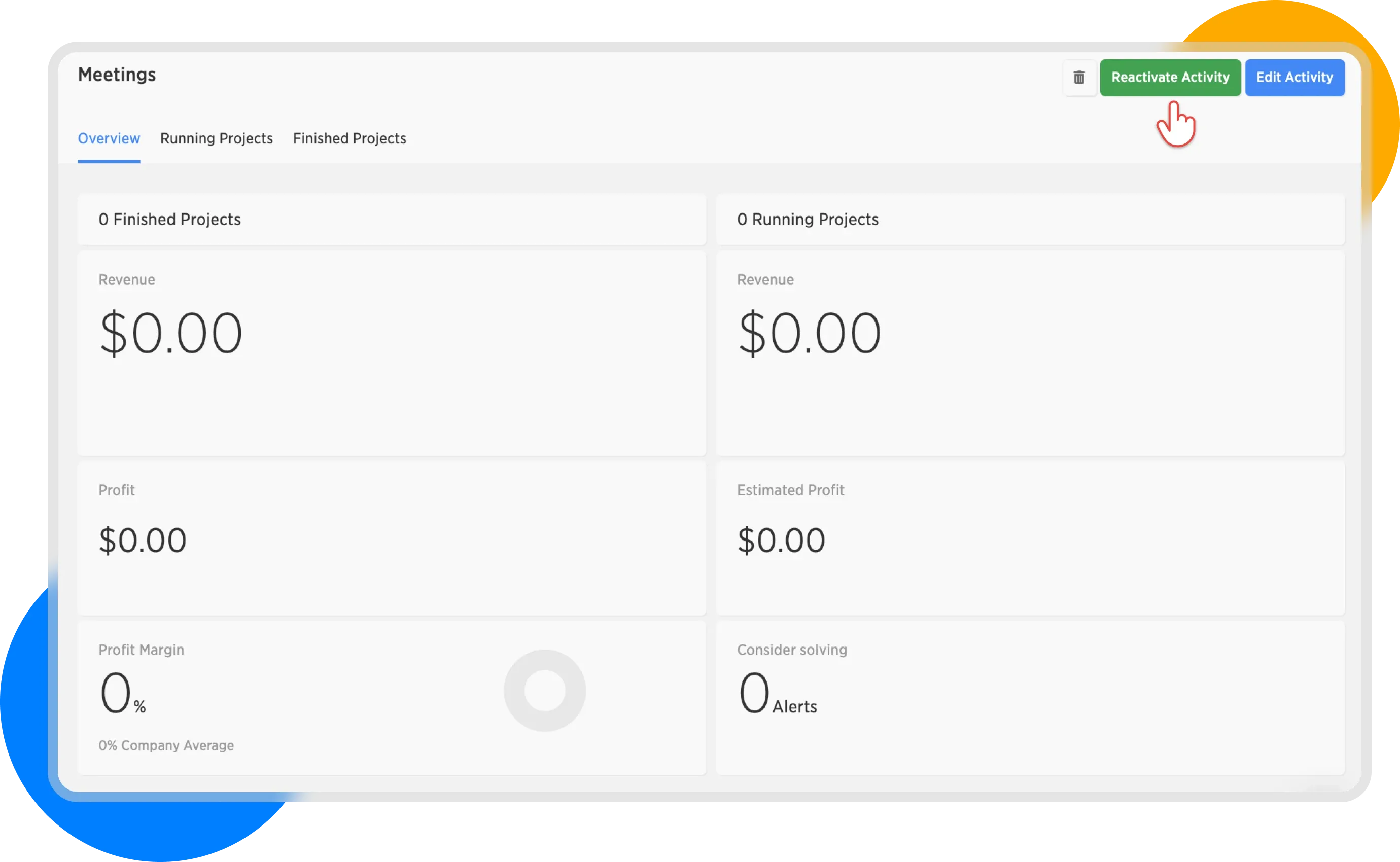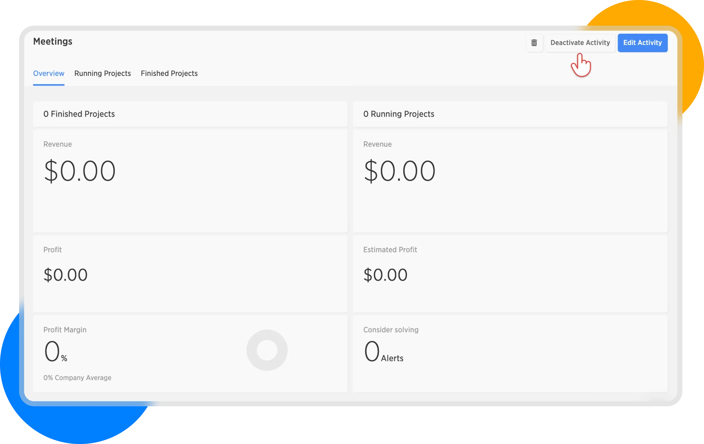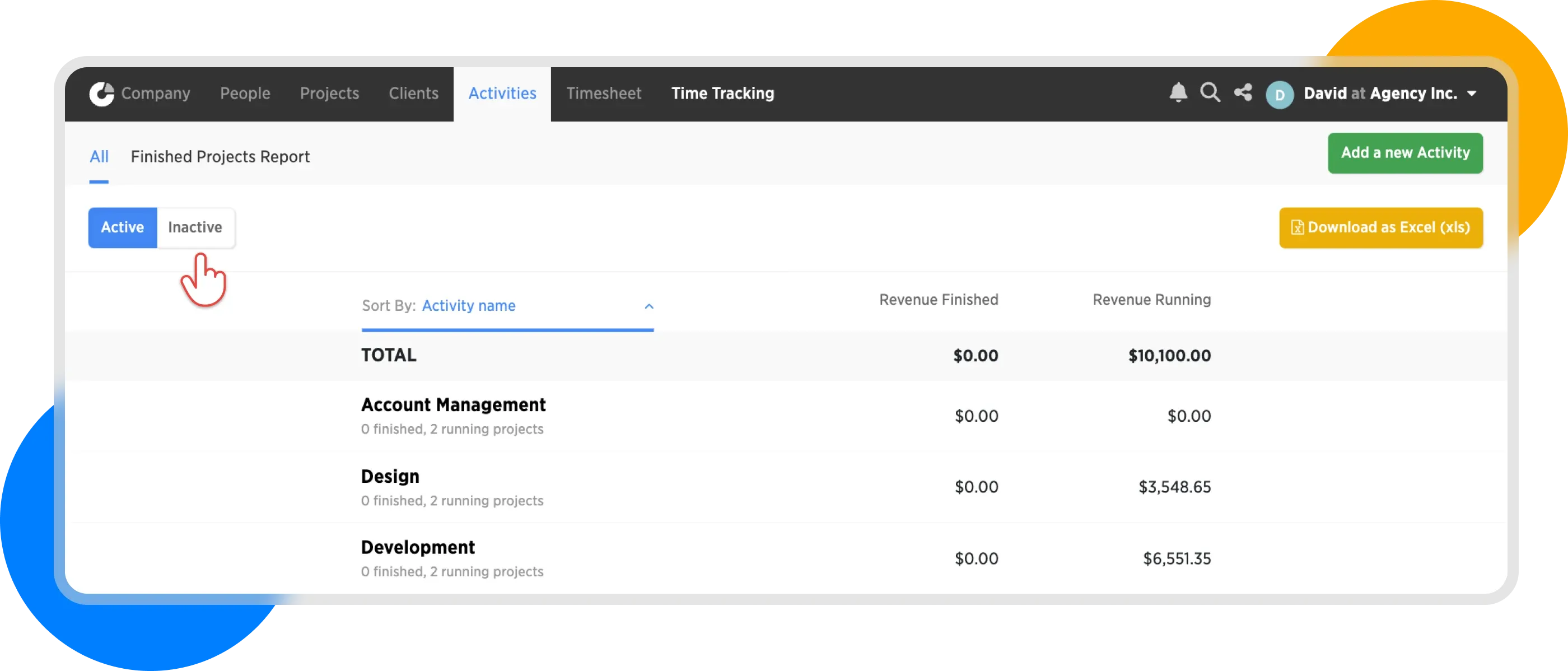 Activities are all the tasks in which your company spends time. These include internal activities, such as meetings, preparing proposals, etc., and also client work, such as creating a graphic design, programming, or meetings.
