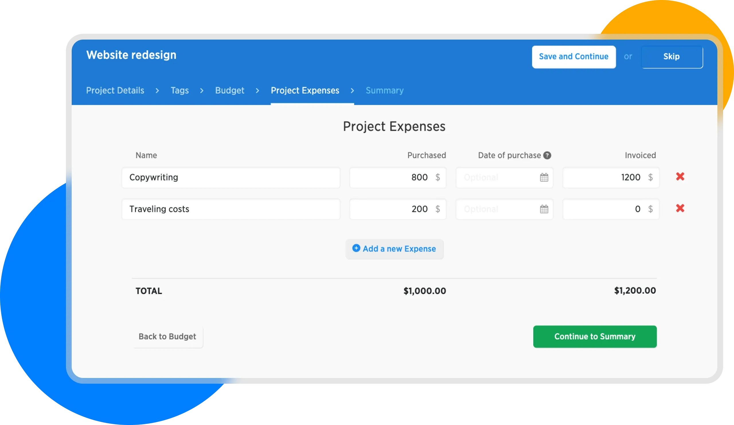 We can move to the next step by clicking Continue to Project Expenses.