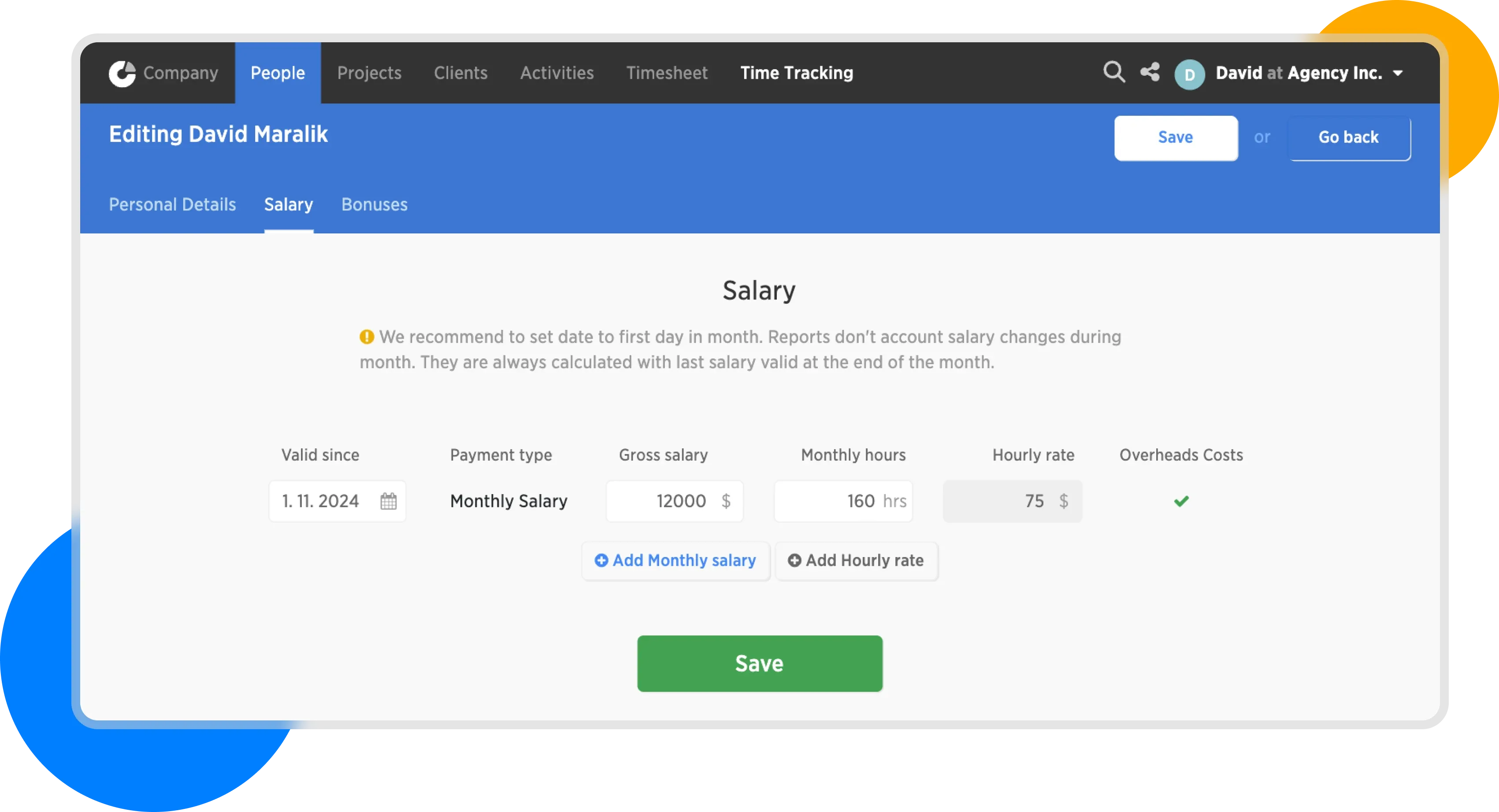 Ideal for recording bonuses and rewards for individual employees. Bonuses document one-time expenses that we allocate to a specific person as a cost for a given month.