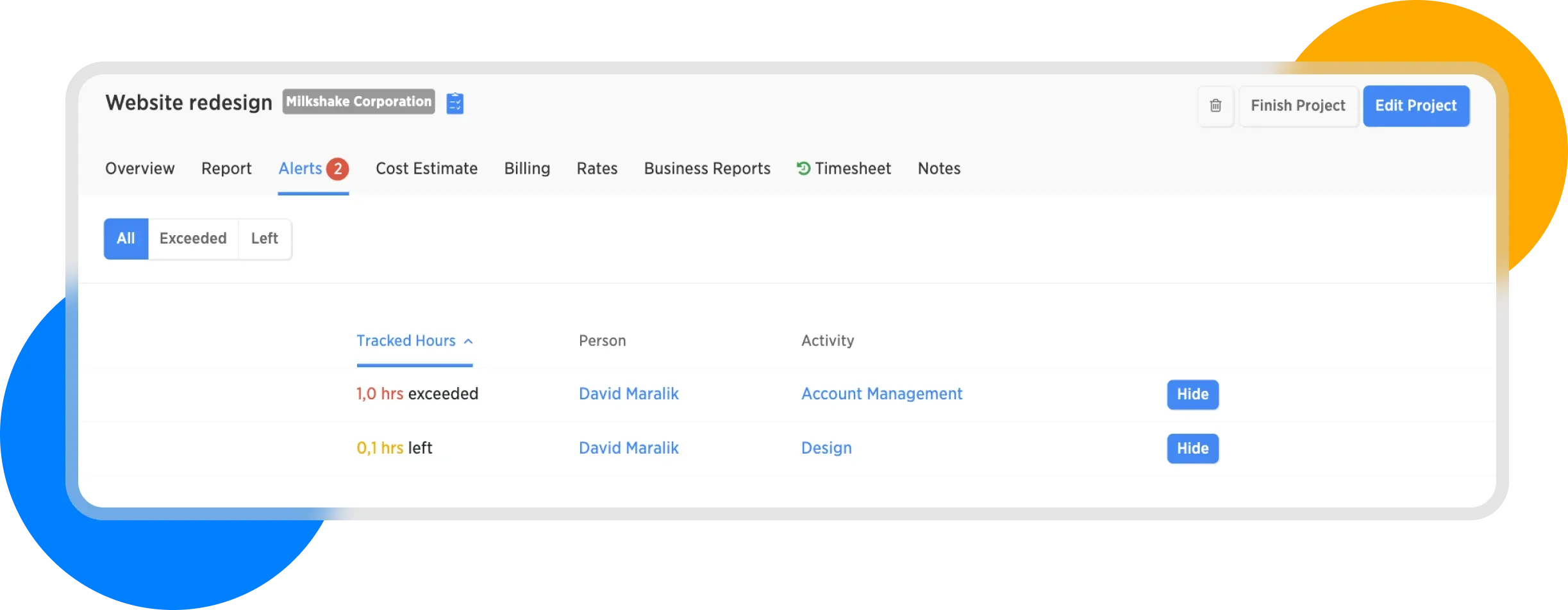An alert will be displayed for a project whenever more than 80% of the time allocated for that project has been used, or if all the time has been completely used up.