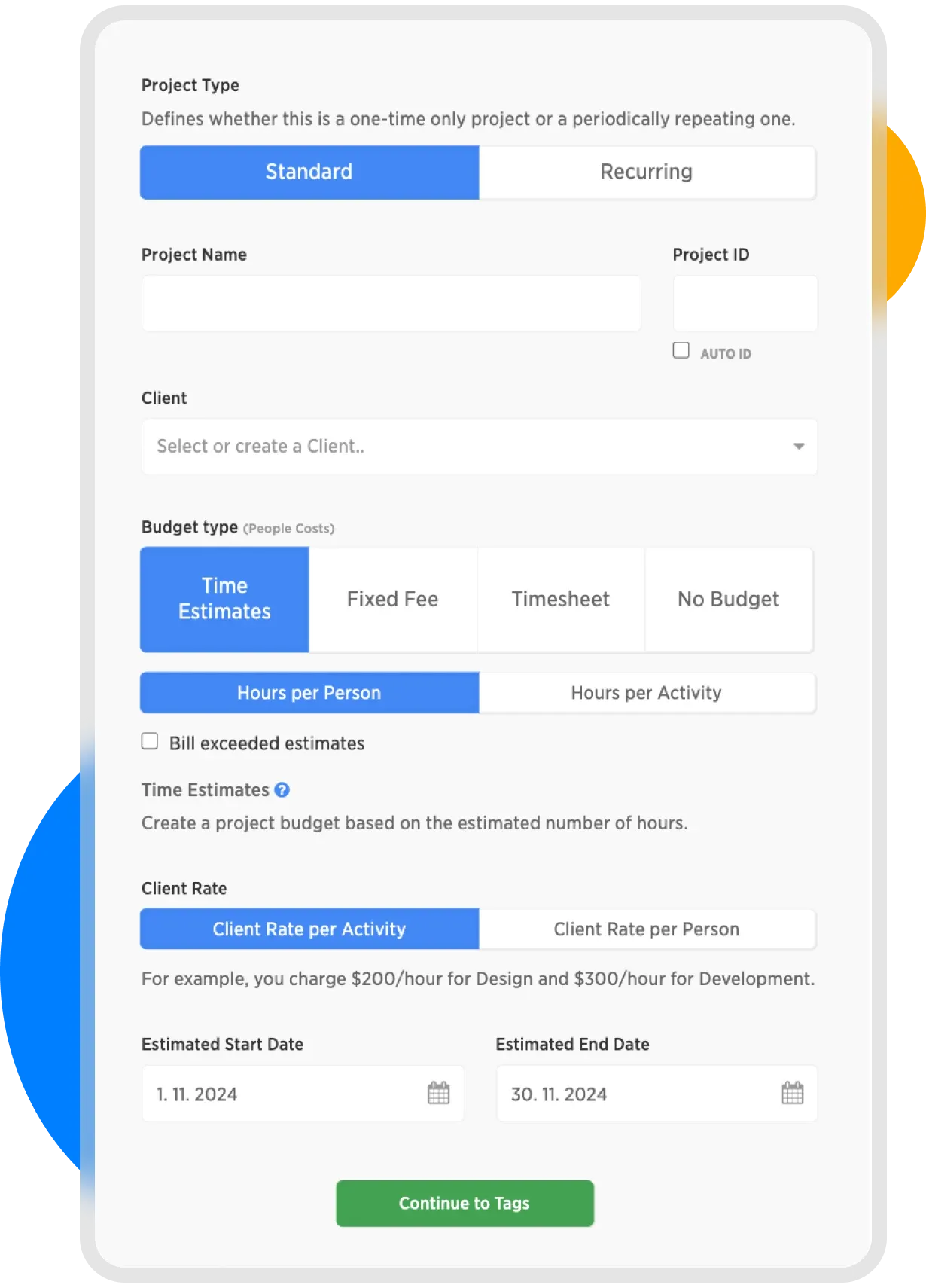 This budget type creates the project price retrospectively, based on the actual time worked. You can choose the client rate by: