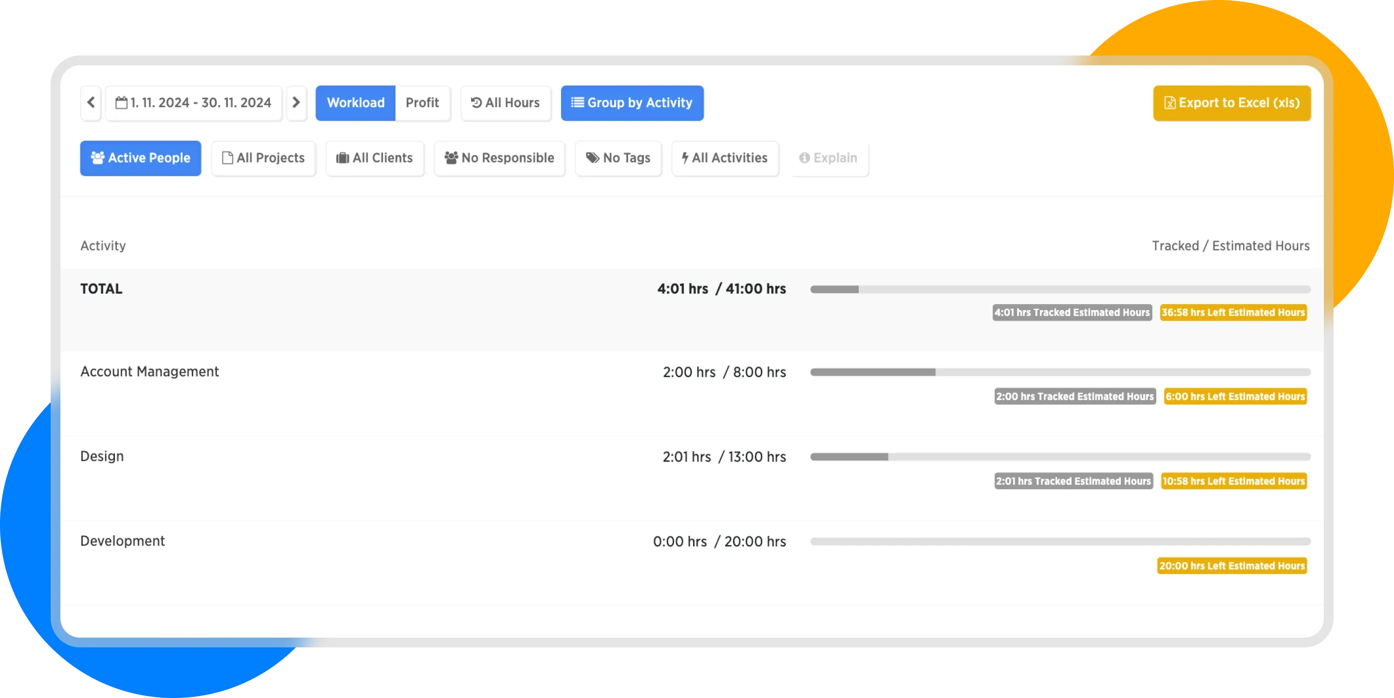 The business workload report shows us a view of tracked vs. estimated hours.