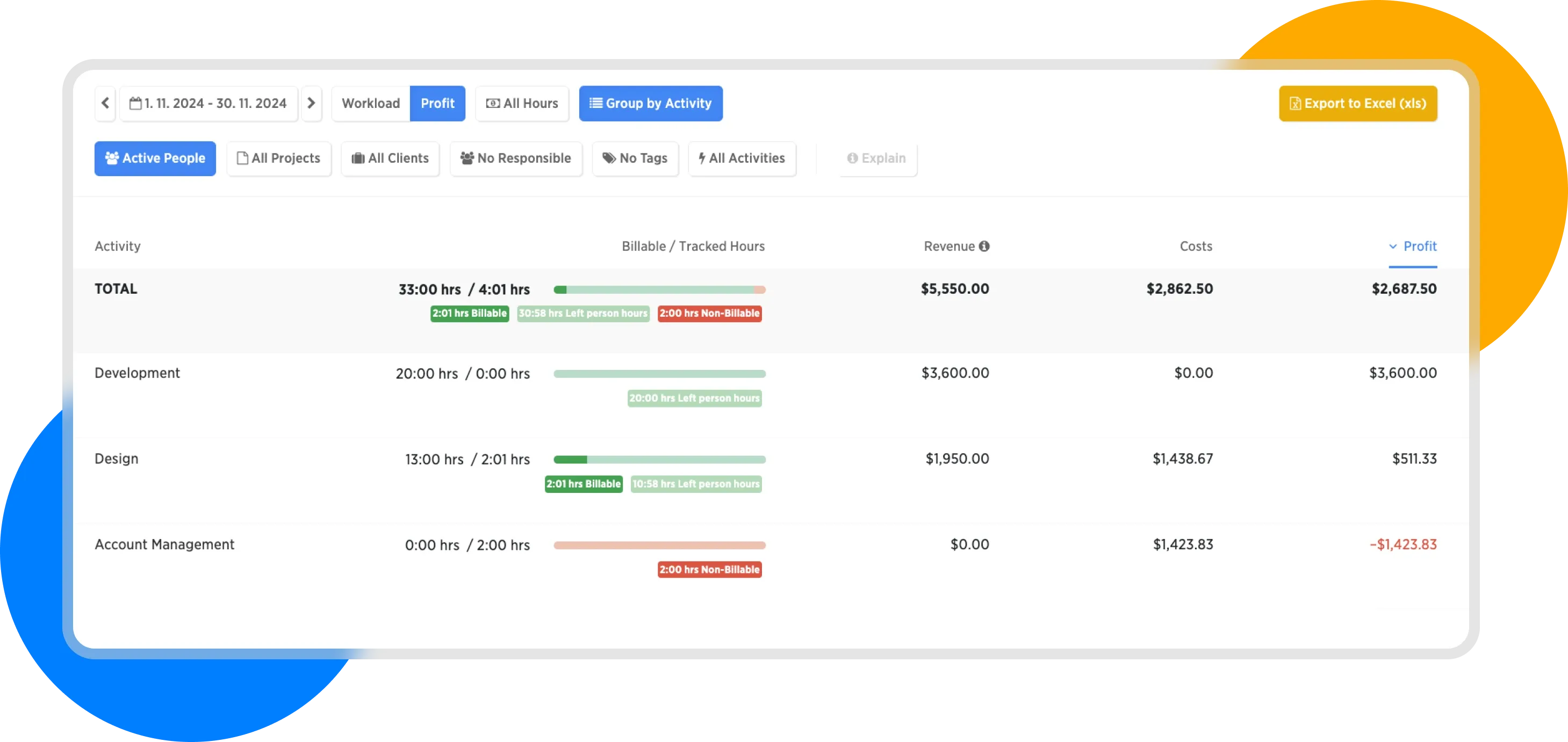 You can switch between these reports using the double-button Workload | Profit.