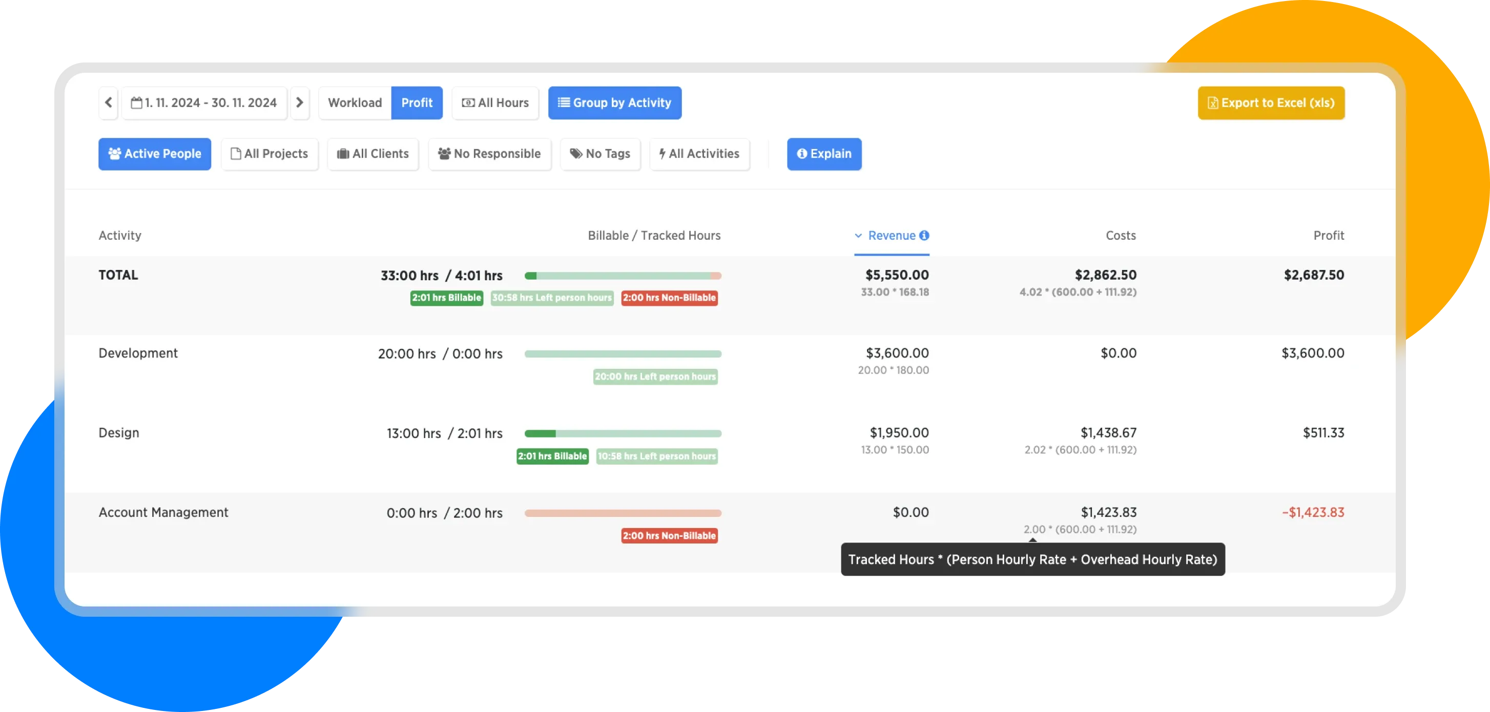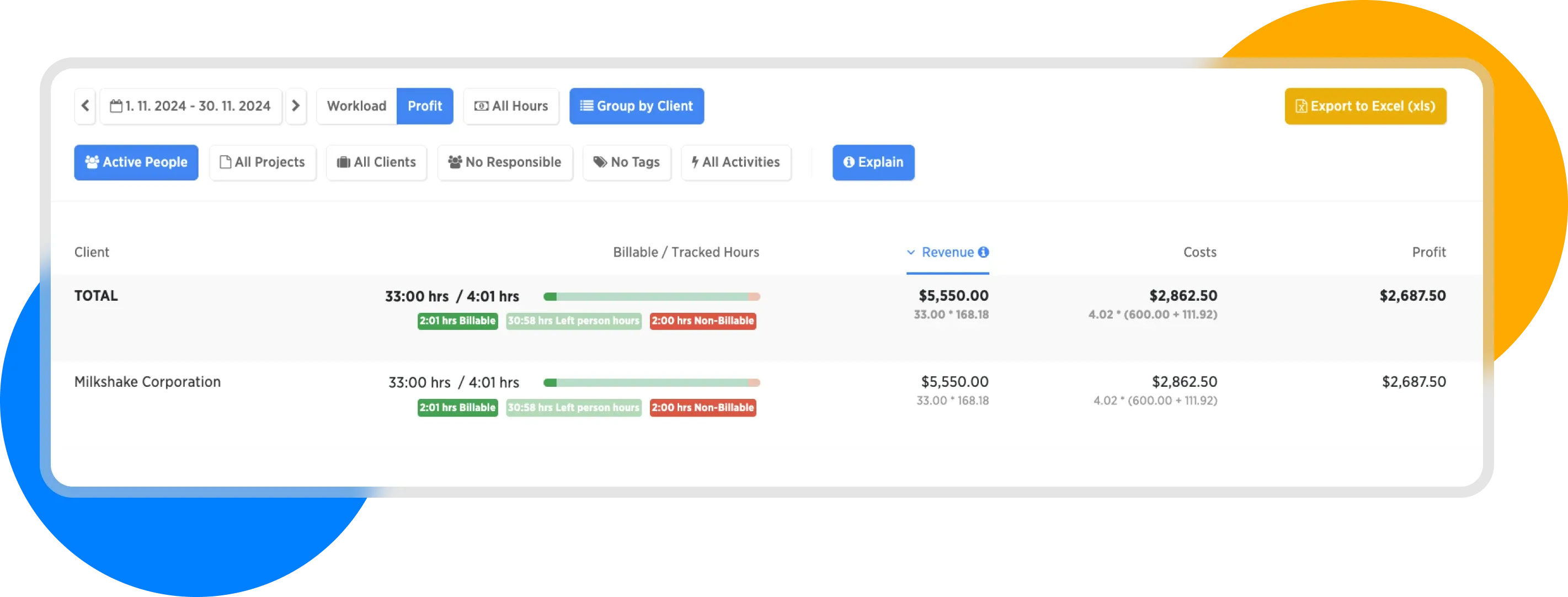 Here we see how income was calculated—that is, how many billable hours and what client rate was sold. Also, costs—how many hours were worked, including the sum of the hourly rate and overhead cost.