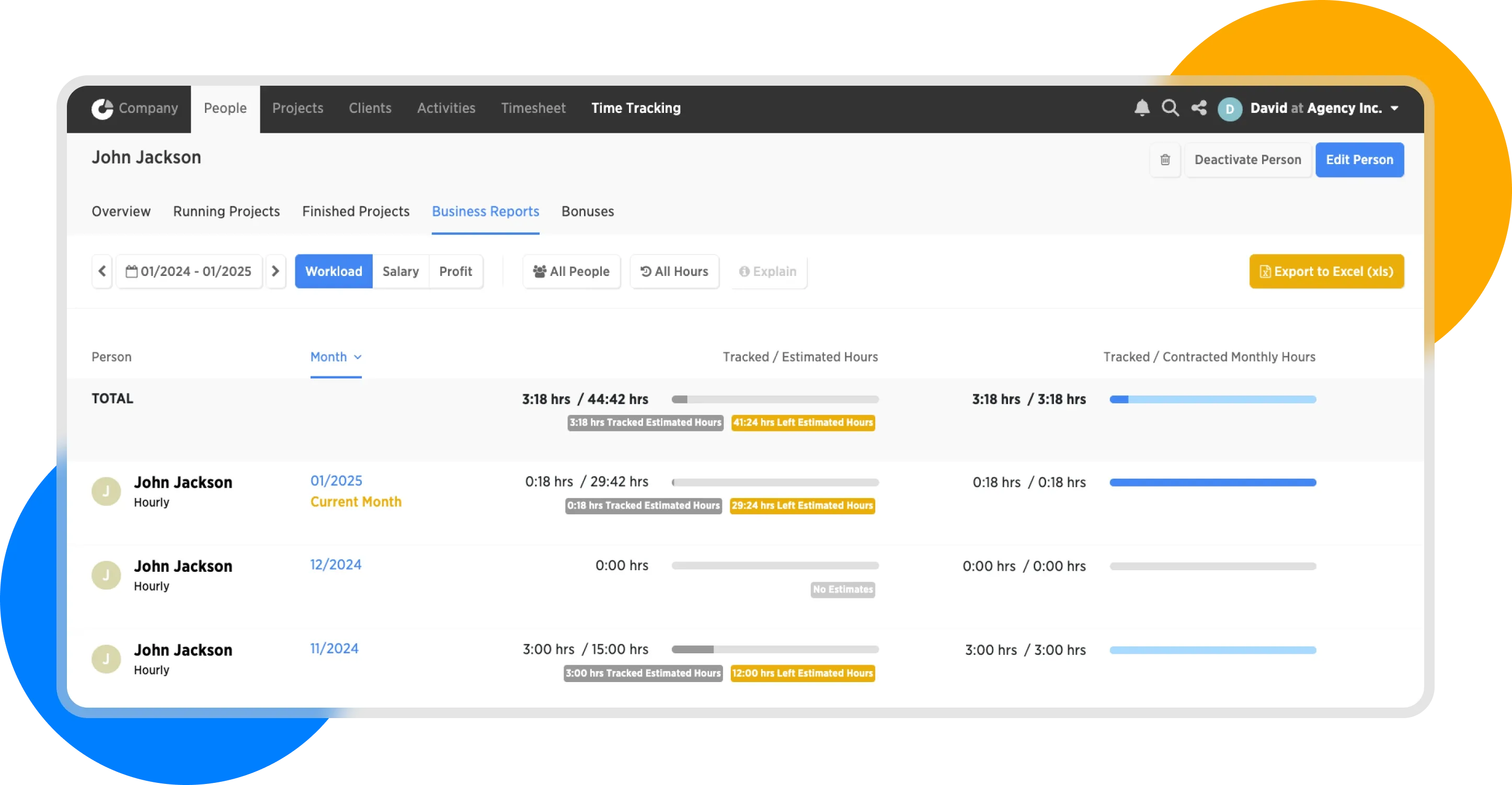 A similar report for a specific individual can be displayed in the People module. Select a specific person and click on Business Reports. Then views on the Workload, Salary, and Profit of that person are displayed.