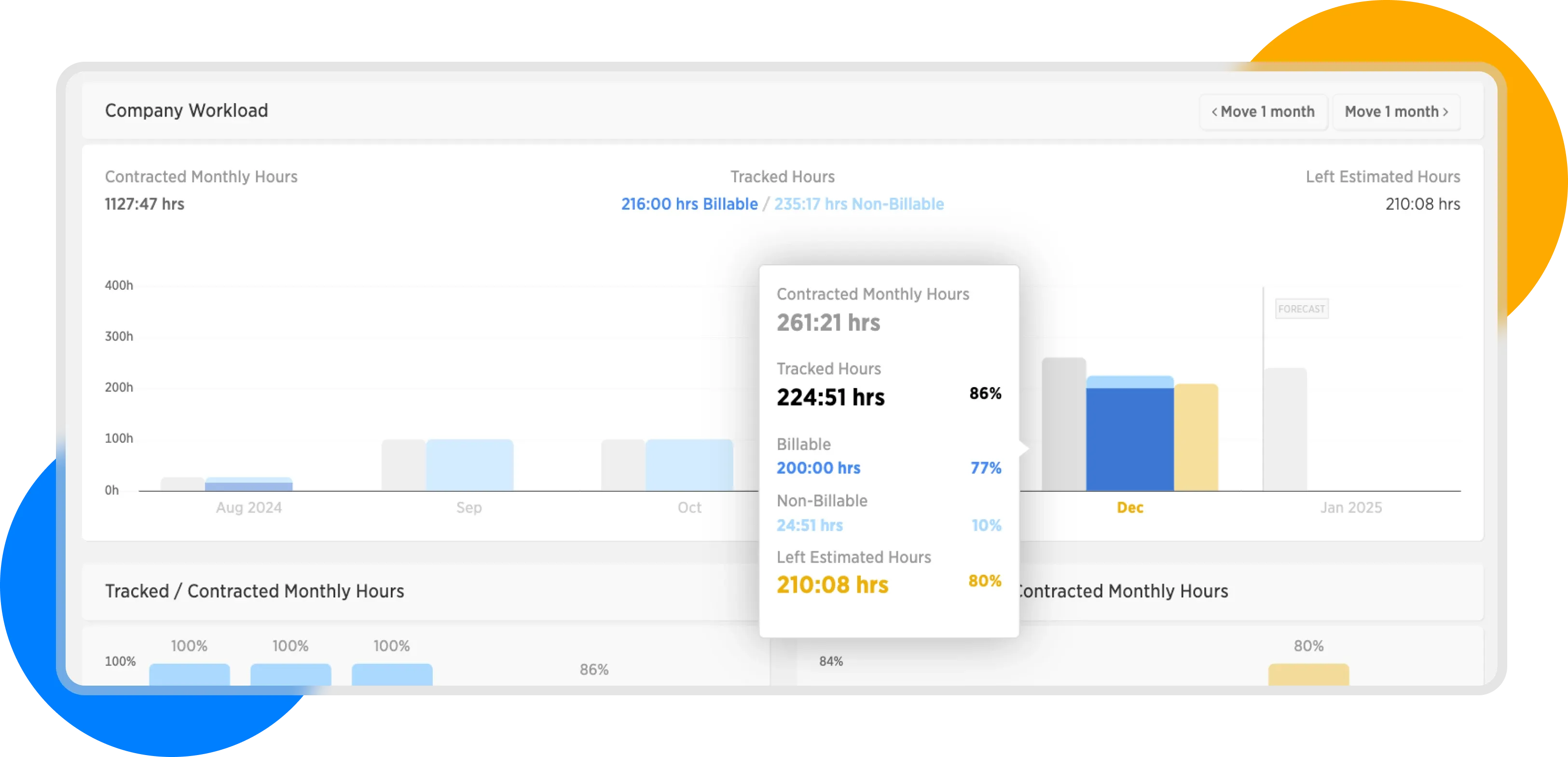 Hovering over the chart displays specific numbers of contracted hours, and the number of billable and non-billable hours. As elsewhere in the application, light blue represents non-billable and dark blue represents billable hours.