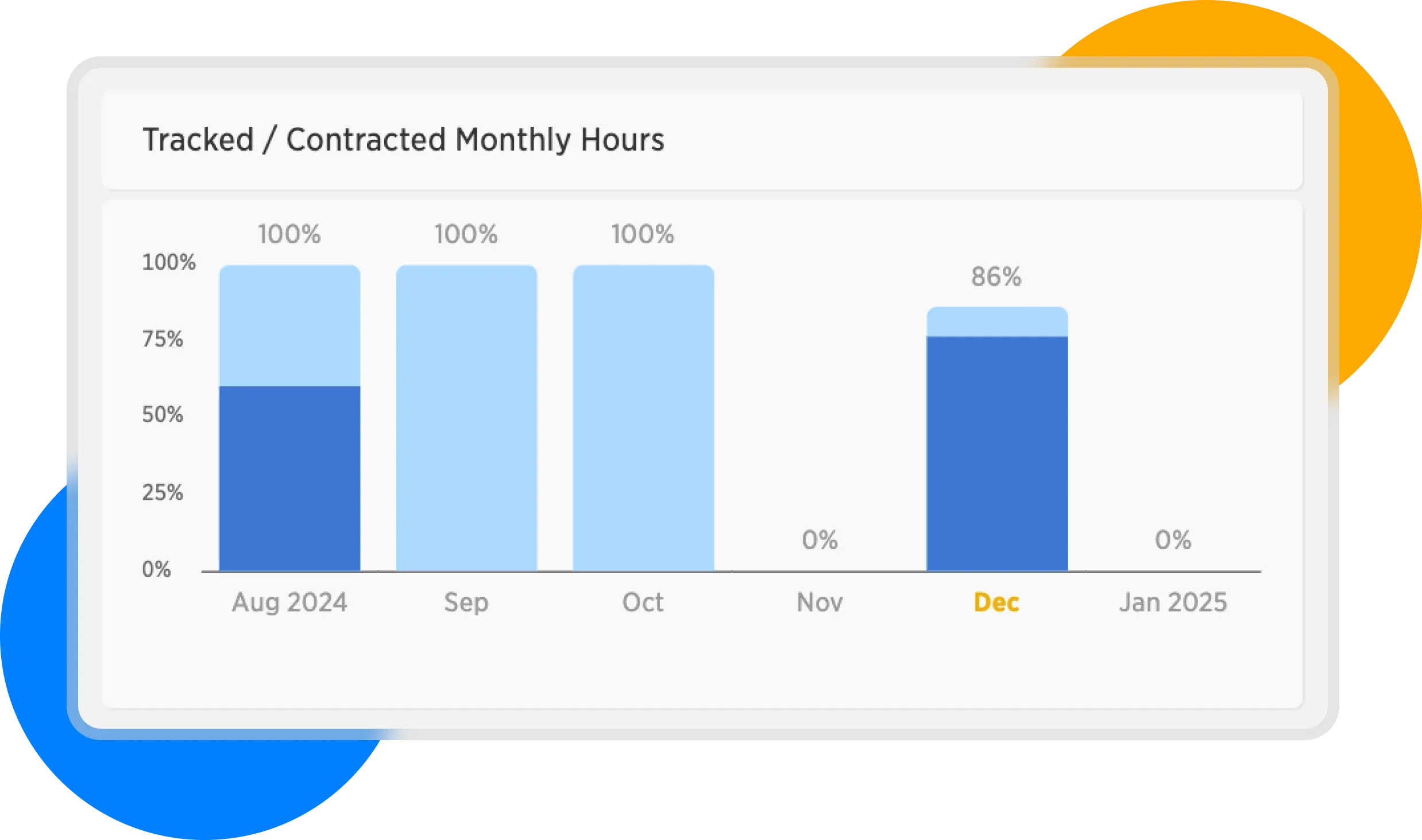 In our example, we see that in the month of November we utilized 0% of the monthly contracted hours. The yellow color on the month always indicates which month is current. In our case, it's December.