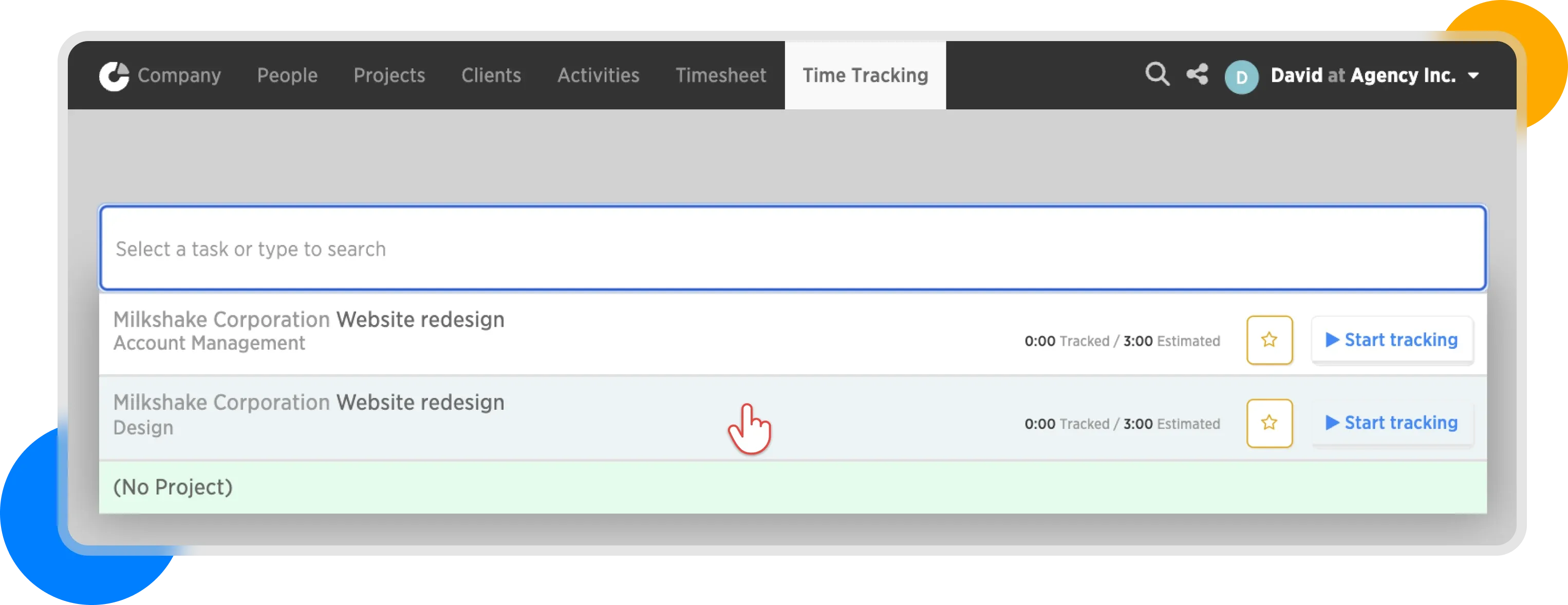 In the Select a task or type to search field, search for the task for which you want to track time. (You must be assigned to a project's budget.)